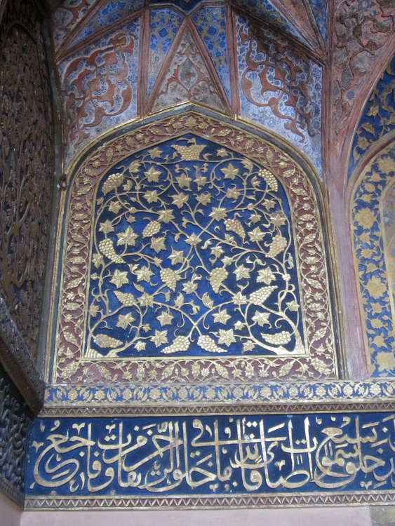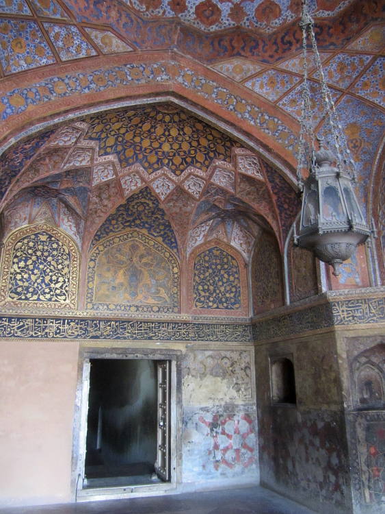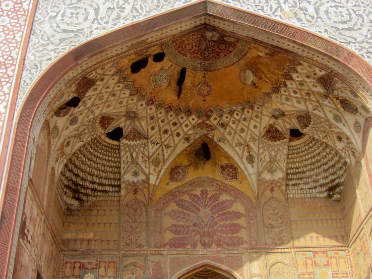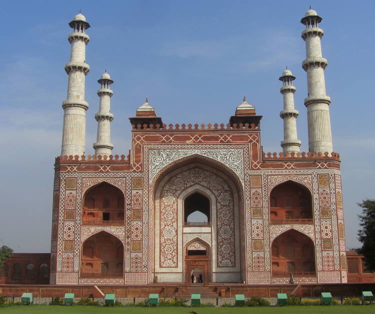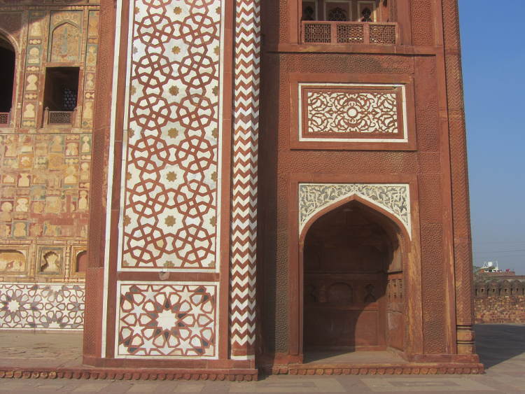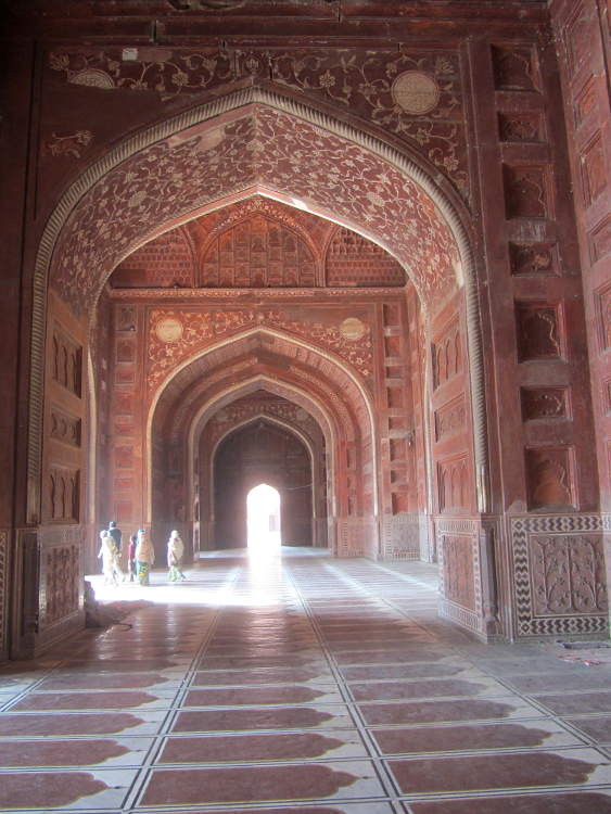 Once through the gates I had time to appreciate this stunning building and it was stunning. In fact there were a few stunning buildings. The first was the huge gateway built of red sandstone strikingly inlaid with white-marble and with four three storey minarets at each corner. Once through the gateway you face the mausoleum itself which is more delicate. Surrounding the mausoleum are large manicured gardens, home to chital deer, antelopes, monkeys and many species of birds including the quintessential Indian bird the peacock. Really impressive. In common with many grand Mogul buildings, the surrounding garden is described as a charbagh and divided into four with the mausoleum at the centre surrounded by raised walkways leading to the four gateways. Also in common with other Mogul tombs, the inside is very plain. In fact there is a narrow inclined passageway which leads to the false tomb at its very heart which is also very plain. I say false, as the actual tomb is buried below, the same as at the Taj Mahal.