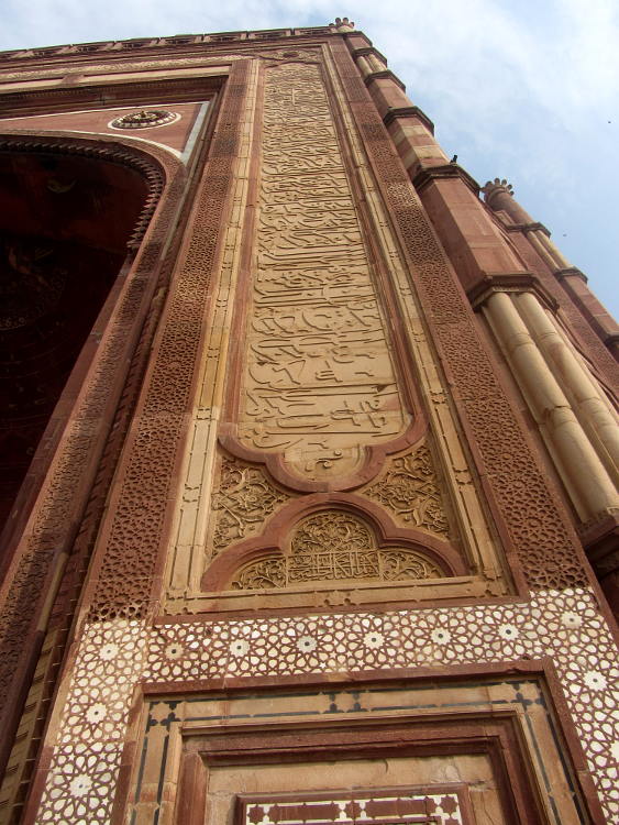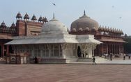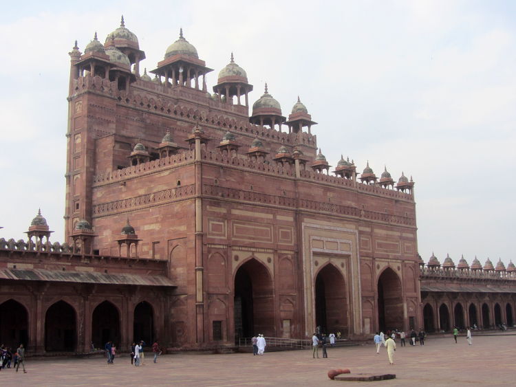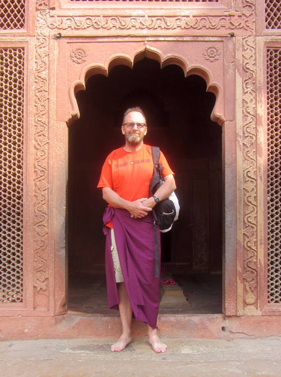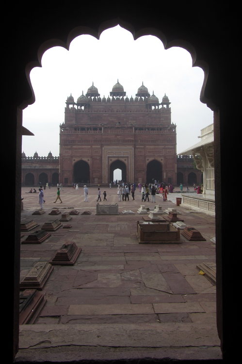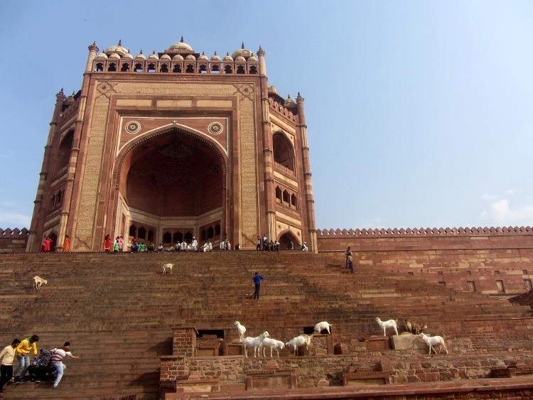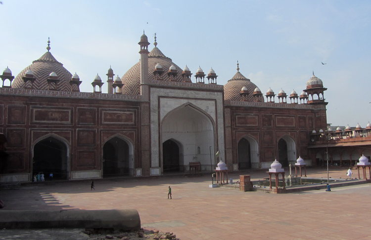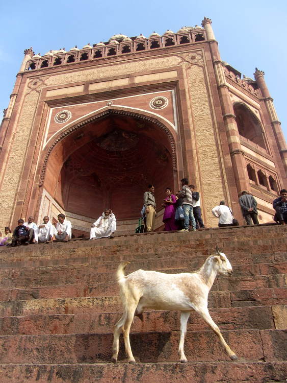 I arrived in Fatehpur Sikri pretty early. The driver told me he had to stay in the official carpark so I had to walk the rest of the way and he pointed me in the right direction. It was getting warm already but I soon arrived at the base of the stairs to the Buland Darwaza. This is the great monumental entranceway into the courtyard of the mosque and from there into the palace proper. It's free to go here but I had already made a big mistake. I was wearing my shorts like I had been doing for my entire trip throughout India, visiting many mosques along the way. But here, at one of the most touristy places in India, I was told I had to wear a sarong to cover my modesty and of course I also had to have an "official holy guardian" who assured me he wasn't a guide. I have to say that the guide books are constantly warning gullible tourists of the hordes of touts and guides who will bother you at every turn of your trip to India. And as this was the only time it had happened to me, I was happy to play along. Anyway, I wandered around the mosque and the courtyard and it was all very impressive and pleasant and my guide official holy guardian told me interesting things about the place then of course I waited for the sting. But it didn't really come. He brought me to his brother who had his various knick-knacks and souvenirs for sale but it wasn't a hard sell. Eventually I actually bought a carved soapstone tea light from him for 50Rs (after starting at 1500RS!) and gave him another 50Rs for showing me round.