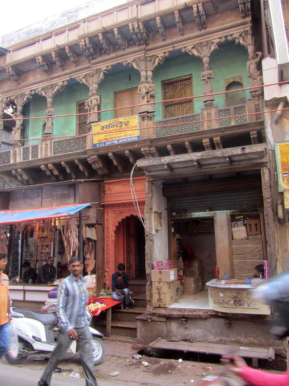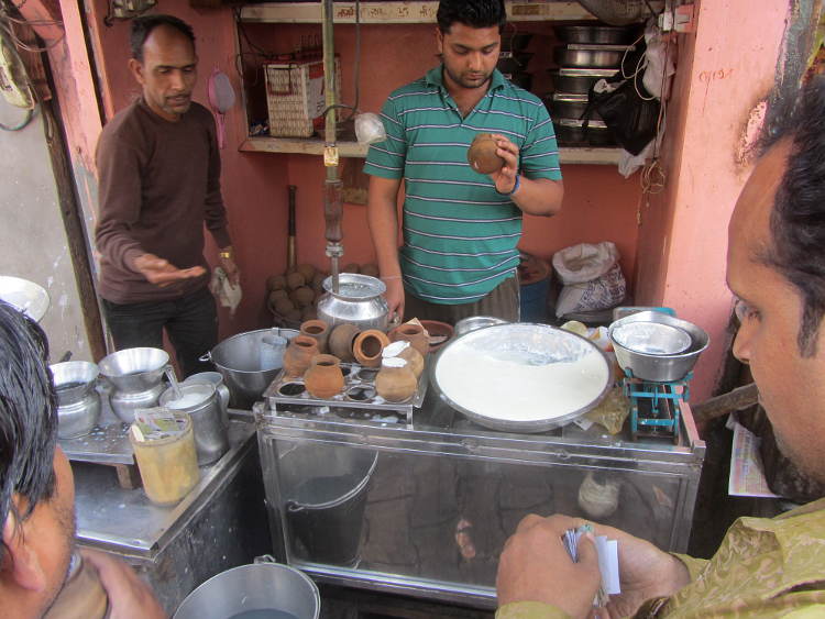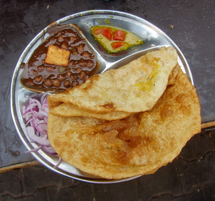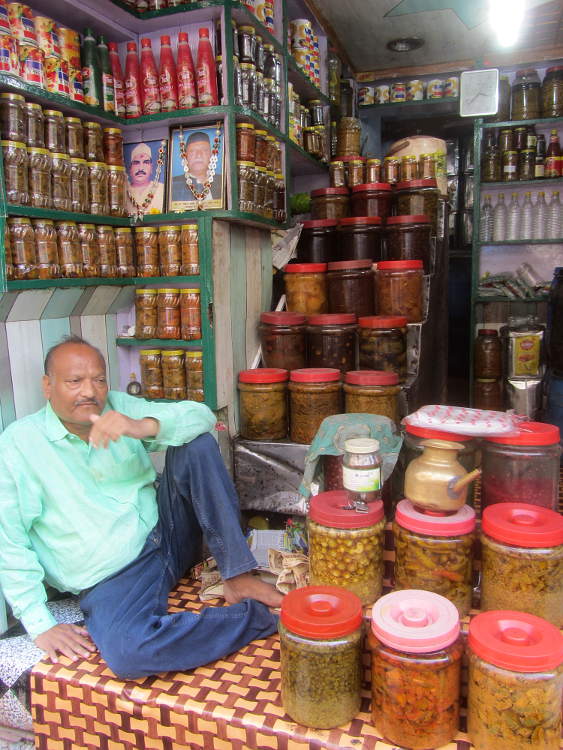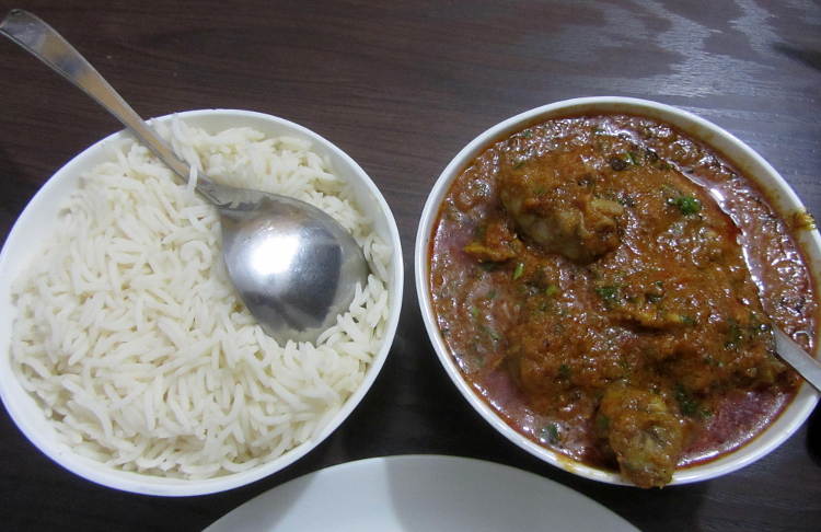 The entrance/exit to Agra fort is a bit out of the way so this time I took a cycle rickshaw for the trip around the walls and into the heart of old Agra. It was now way past lunch time but I spied a group of blokes standing around eating something interesting so I joined them. I think it was a type of chickpea curry with fried bread. At 30Rs for a large plate it was just the ticket!