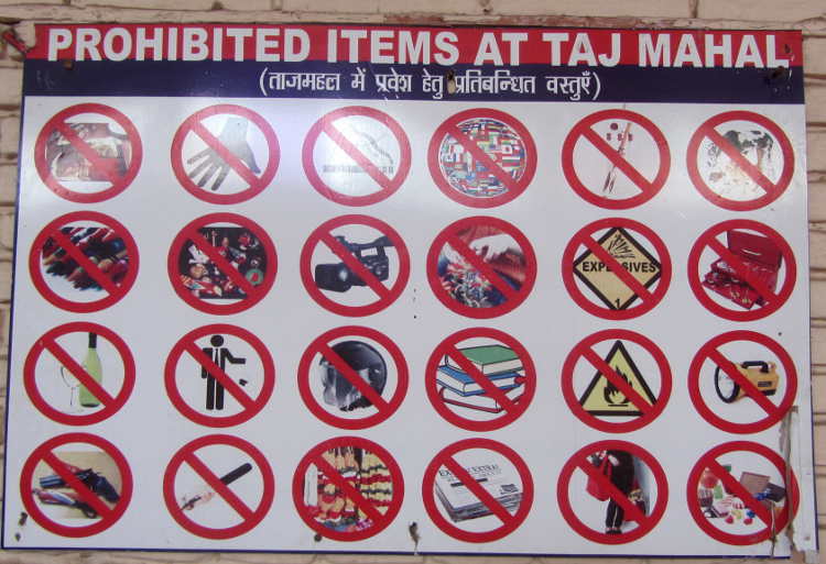 Most tourists headed off to the Taj at dawn to get those rose coloured early morning photos. However, it seemed to me, later was a far better option. A lie in and fewer tourists. I think I got the best deal. The hotel was just a 5 minute walk away from the East gate which was very handy for me. According to the Lonely Planet, you can buy your ticket at any of the four gates but the east gate has the shortest queues of the lot, but this is because the ticket office is inconveniently located a 1km walk away at Shilpgram, a dire government-run tourist centre. This was fine by me, as there was no queue as promised and they provided electric shuttle buses to the entrance (included in the new ticket price of 1000RS!). However as I was buying my ticket I was told that I had to leave my small bag behind and my notebook. No notebooks? I was then directed to a sign which included all the other things not allowed including newspapers, crayons, flowers and explosives. Hmmm. Once at the Taj there were plenty of other signs: No walking on the grass, no photography of the men carrying out repairs and no videography (I managed to bypass this one and took a sneaky video when I was there - see below).