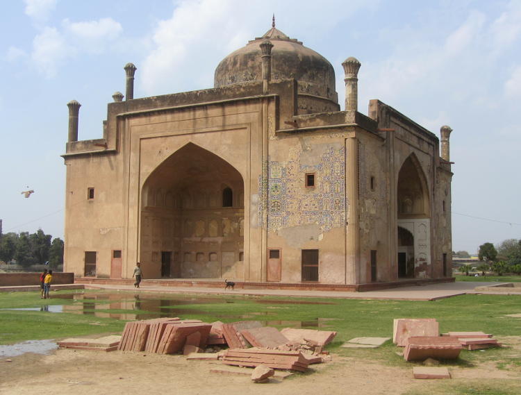 Like the Taj Mahal it is on the banks of the Jamuna river but this time around the bend to the north and on the opposite bank. I came out of the Baby Taj compound and continued walking up the busy road that follows the river and past a hodge podge of buildings, shops, houses, waste land and impromptu garages and motorbike repair shops until I got to my final destination. This was the Chini Ka Rauza. The Taj was packed, there were a few at the Baby Taj but here, I was the only tourist admiring this once impressive monument. I found it quite charming as it hadn't undergone the intensive restoration of many similar places but it was still very impressive. It was the tomb of a man who was initially a poet but then rose to prominence as the Prime Minister of Shah Jehan. It is very different from all of the other Mogul mausoleums, more Persian, and was once covered in glazed tiles. It is already impressively situated on the banks of the river and if they ever get round to a full restoration it would undoubtedly become a major tourist destination. For better or worse. For now, I only had to share it with a few lads playing football and a couple of kites making their nest in a nearby tree. Oh and a grumpy attendant who I woke from slumber inside the tomb.