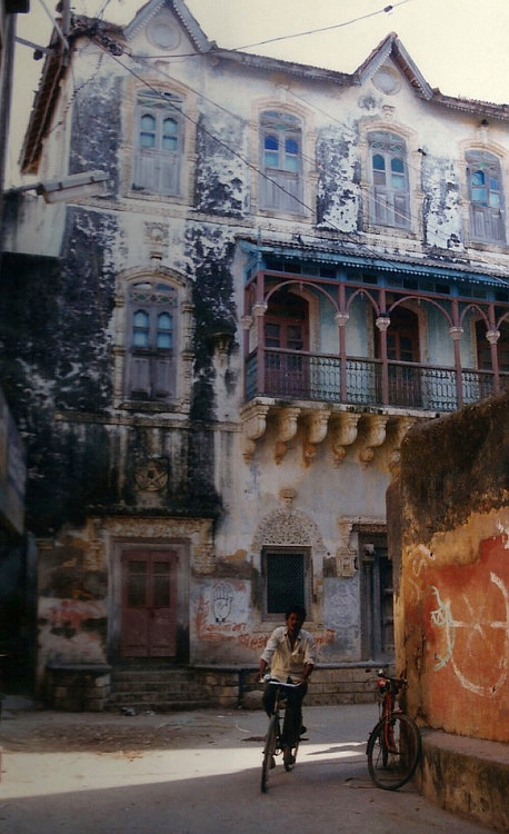 So I was waiting at the bus stop in Jaisalmer waiting for the bus to Barmer bathed in sweat. It was a fairly short hop of 2 hours. But once in Barmer, I noted that after the relatively clean streets of Jaisalmer I was back to the stench and pollution of a big Indian city and reflected that it wasn't so much of a surprise that there was currently an outbreak of bubonic plague. From Barmer I took an overnight bus to Bhuj arriving at 6am. I got a taxi to The City Guest House. The singles were pretty grotty windowless, airless rooms so I took a double at 100Rs which wasn't much better but it was clean and had the luxury of a window. After a tough night in the bus I got a few hours sleep before exploring the town. I'm not sure why I went to Bhuj as it's way off the beaten path but I seemed to enjoy my time there, with colourful people, narrow winding streets full of hustle and bustle and plenty of traditional (crumbling) architecture. The old palace was interesting but I think a lot of this part of town was destroyed in an earthquake in 2001. It was curious that I was now in Gujarat and only here had I seen men wearing Jodhpurs - I never seen any in Jodhpur the city (which is in Rajasthan).