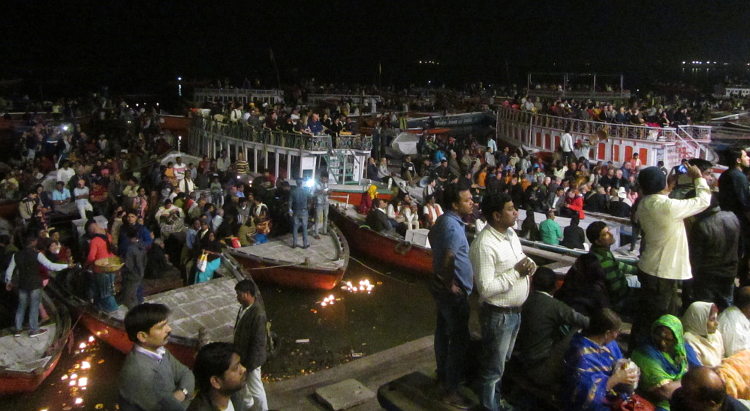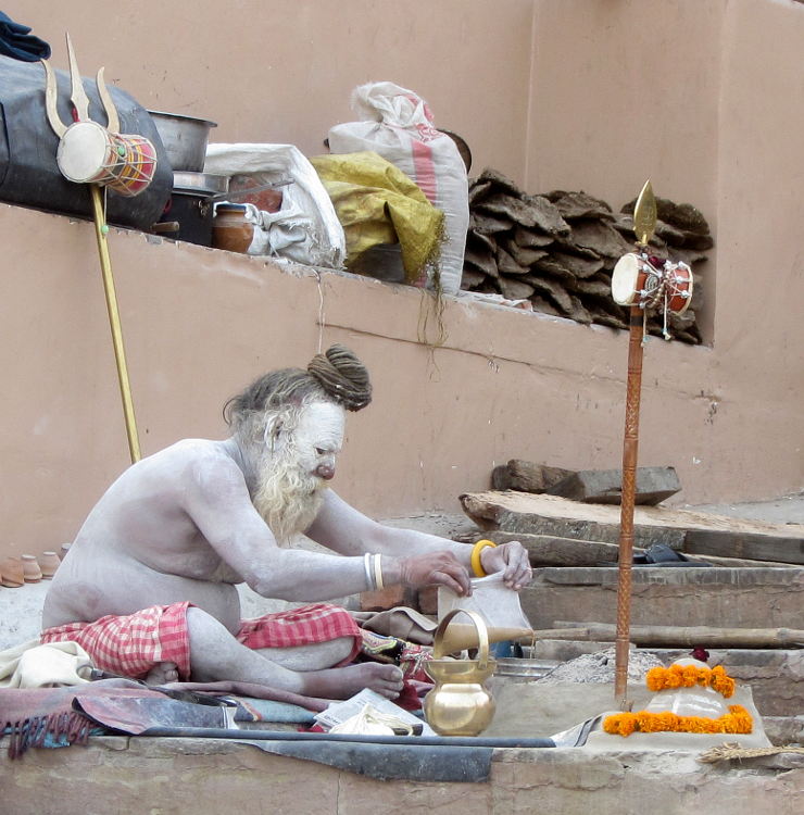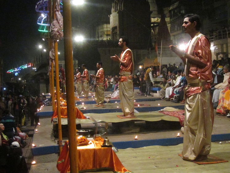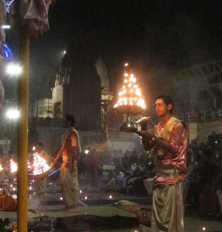 That evening I returned to the main ghat, Dashashwameth, to attend the Ganga Aarti or fire ceremony. Making offerings to the river has been going on for centuries but the present ceremony is apparently a fairly recent phenomenon mainly for the benefit of tourists but it certainly appears spiritual and is an impressive show. The ceremony commences with the priests (pandits) blowing conch shells, and continues with the waving of incense sticks in elaborate patterns and circling of large flaming lamps that create a bright hue against the darkened sky. The movement of the lamps, held in the pandits’ hands, is tightly synchronized to the rhythmic chants of hymns and clangs of cymbals. The lamps are lit and circled around by the pandits in a clockwise manner, accompanied by chanting or songs in praise of Mother Ganga. The idea is that the lamps acquire the power of the deity. The heady scent of sandalwood thickly permeates the air. After the ritual is complete, devotees will cup their hands over the flame and raise their palms to their forehead in order to get the Goddess’s purification and blessing.