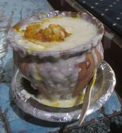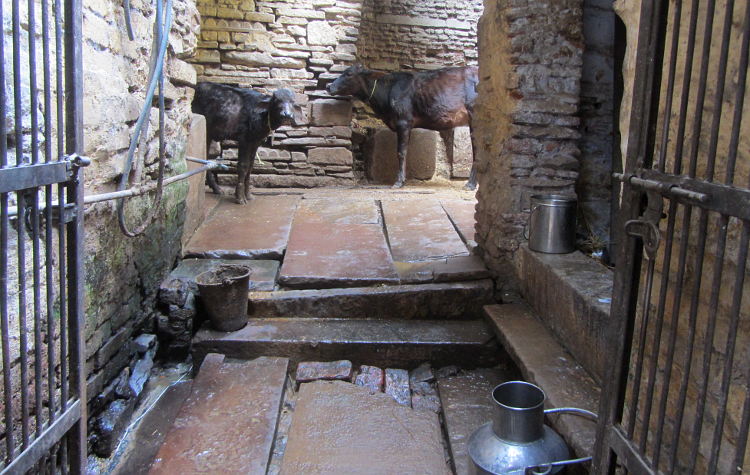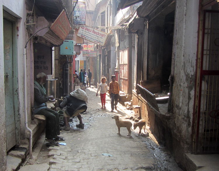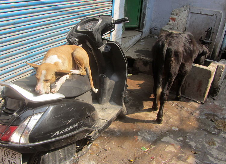 Away from the ghats you enter the old parts of the city which consist of a warren of tiny lanes called galis. At first they can be fairly intimidating and you are guaranteed to get lost but that is part of the fun. Like a lot of tourists I paid for a guide to show me the highlights and it was well worth it as I would have seen some places 10 or more times and others not at all as I went round and round in circles. Although there are literally thousands of temples in Varanasi, the most famous of the lot is the Vishwanath Temple. You won't see many photos of this place, not because they aren't allowed, it simply is because it is right in the middle of the maelstrom of alleys and so you can't fit it into a photo! It is also surrounded by police and soldiers as there was a terrorist bomb here a few years ago and as you can imaging in the tight alleys carnage would be very likely. One of the stranger highlights for me was the Blue Lassi. This is just a hole in the wall yoghurt shop where an old guy mixes lassis and the customers huddle together on a couple of old wooden benches. I tried the apple and banana and after a hot day wandering the streets, it was divine! Just round the corner was the government bhang (marajuana) shop. I decided not to get anything here - I was high enough after the lassi! Another interesting place I found was a dairy. Just off a narrow lane there were cows being milked. A bit odd in the middle of town but maybe not so much given how much milk is actually used in India - in lassis, curd, various sweets and just drunk as milk. I saw many blokes on bicycles carrying old fashioned milk churns.