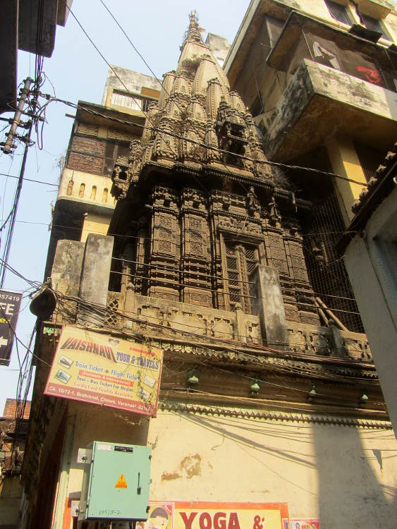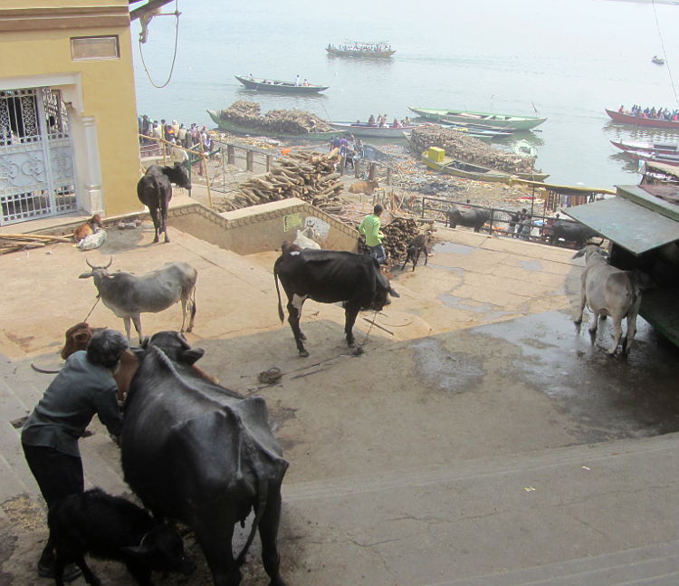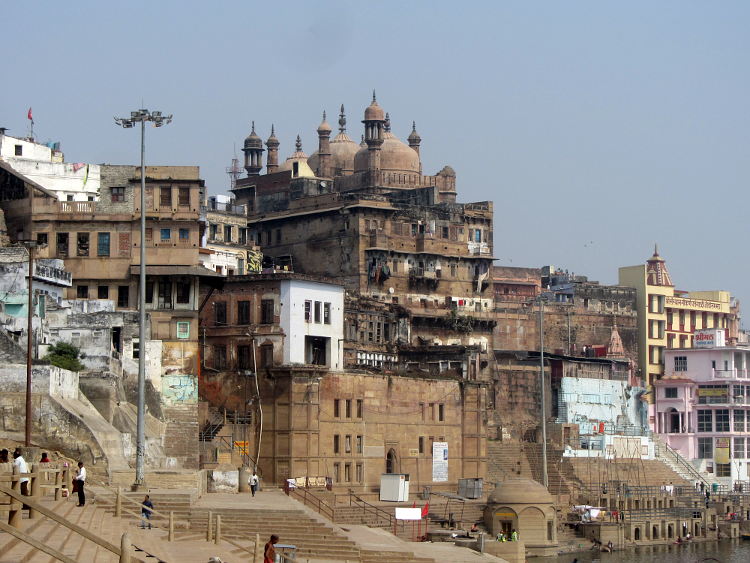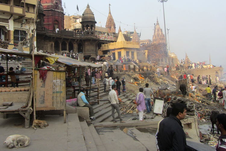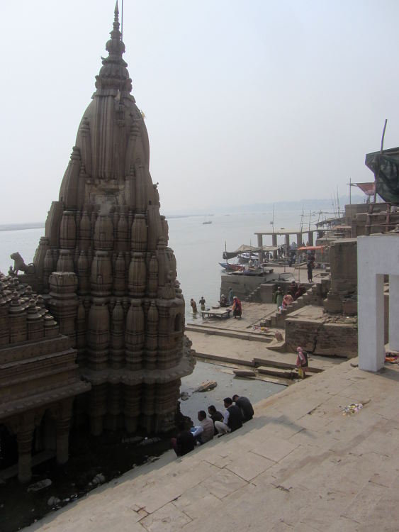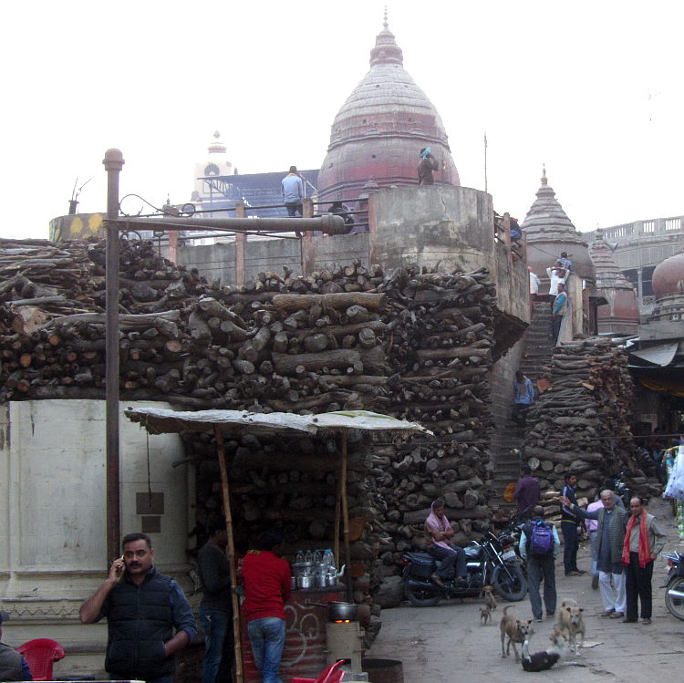 Manikarnika Ghat is one of the most famous as it's the biggest one used for cremations. For someone not used to watching bodies being burnt it is a little strange but perhaps more so because it all seems so humdrum. No wailing or gnashing of teeth but simply people, cows and dogs going about their business against a backdrop of huge piles of logs ready for the next funeral pyre of which there are many. In fact all day and night there are bodies in various states of cremation; some being prepared, some already alight and others just a few glowing embers and the remains of others being dumped into the river. There are quite a few tourists about but when I was there everyone was quite reverential as close-up photography is forbidden and this is policed by some very dodgy characters who seem to be driven by less than holy motives. However, anyone is allowed to view the proceedings up close. Certainly an interesting place. There are many temples lining the ghats, the Ratneshwar Temple being one of the most famous as it has actually fallen partially into the river and become quite a magnet for photographers.