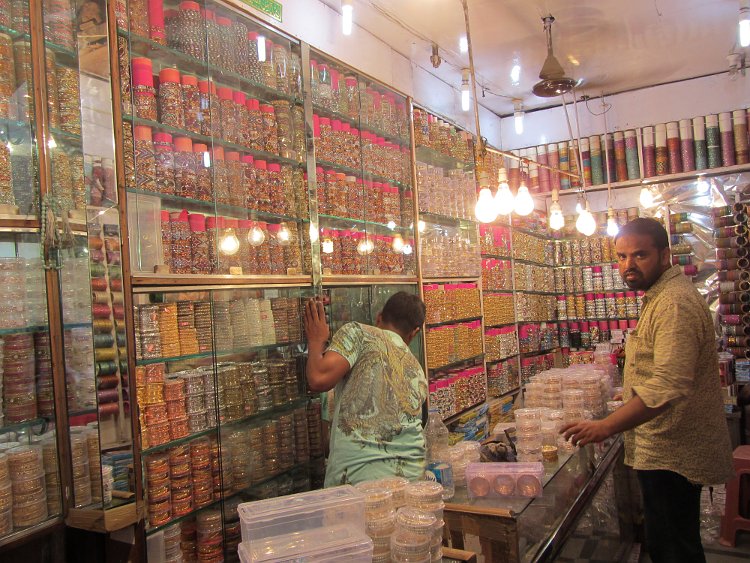 To borrow from the lp again, the old city of Hyderabad is everything you might dream an Indian city to be - narrow lanes thronged with markets, chai shops, wandering animals, autorickshaws, a whirl of noise, colour, languages and religions dotted with stately old architecture in varying states of repair. It was certainly this. I started my journey at Hyderabad's principal landmark - the Charminar. Beautiful as it is, I found the area around much more interesting. The streets are wide close by but they were covered in stalls. Mainly clothes but also so many stalls selling bangles. And not just stalls. One road leading away from the Charminar was lined with shops all selling just bangles. Hyderabad truly is the world centre of bangle salesmen! I also noted that there was a sizeable muslim population here as well. Many of the woman haggling over the clothes and bangles were completely covered in black burkhas. The old city spreads in all directions from the Charminar and contains much of interest including more historical buildings. There are a number of museums here including the Salar Jung museum and the Nizam's museum but I only had time for one, the Chowmahalla Palace. This opulent 18th and 19th century palace was the main residence of several nizams (the muslim rulers of that time) and comprises a number of courtyards and gardens in addition to the magnificant grand Kilwat (Durbar Hall) containing 19 enormous chandeliers of Belgian crystal. It is also a welcome respite from the noise and heat of the surrounding city.