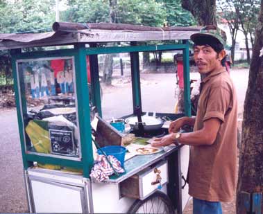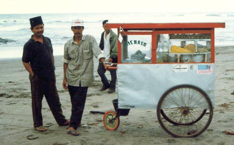 noodle seller on the beach and lumpia basah - Indonesian pancakes