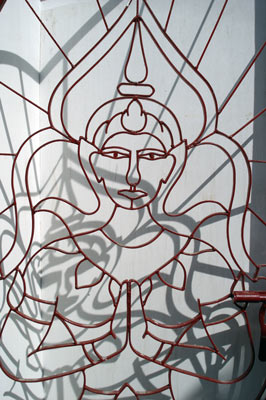 We were here to visit Wat Ratchanadaram (Rajanada). It's quite a new temple dating from the mid 19th century, but is very striking with it's unique black metal rooves, possible influenced by Burmese styles. It's also a popular place to buy amulets. Most wats have metal gates and most are decorated like the one below.